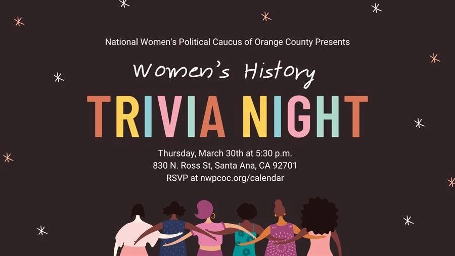 Get ready to celebrate Women's History Month and join the National Women's Political Caucus of Orange County's Women's History Trivia Night!! We will play several rounds of trivia all featuring accomplished women throughout history. Appetizers and wine will be provided!